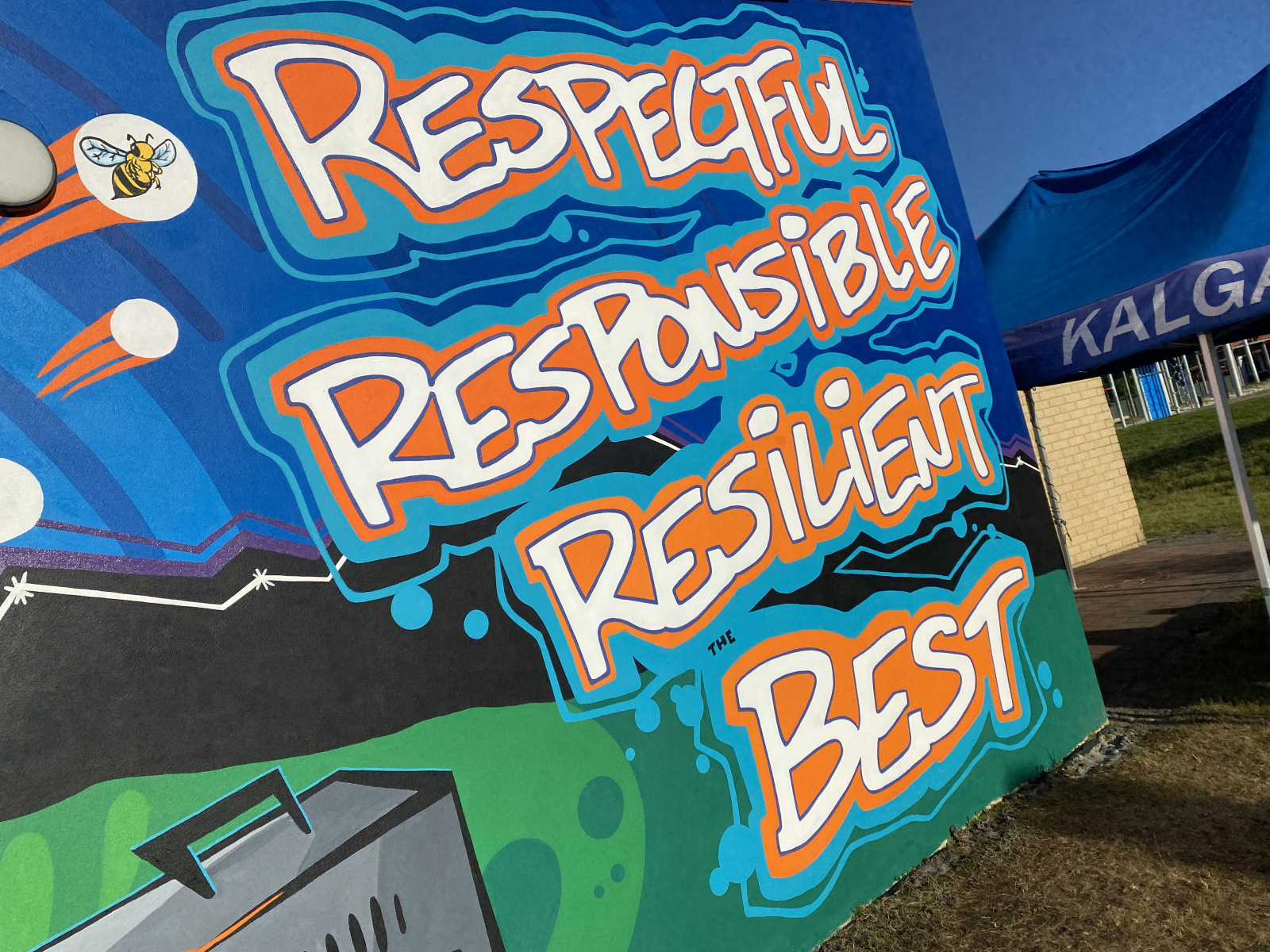 100 Good Stories Mural, Mount Barker, Western Australia. This mural is located on the side of the Mount Barker Community College, and was painted during their Walldog event "Mountains & Murals." Students in the school assisted in its creation with everything from projecting the image to painting large swaths of it under guidance. The words on the right are part of the school's inspirational motto. November, 2022