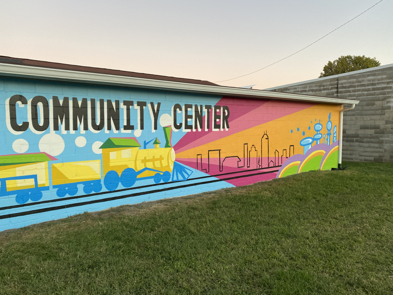 Bright Spot Mural, Brightwood Community Center, Indianapolis. This mural was commissioned as part of the Lilly Day of Service by Eli Lilly & Co. and Keep Indianapolis Beautiful, Inc, for the Brightwood Community Center, teaming with Jarrod Dortch for design and execution. The bulk of the mural was painted by Eli Lilly & Co. volunteers, and as the project was designed, grew to include all four sides of the building. September, 2022