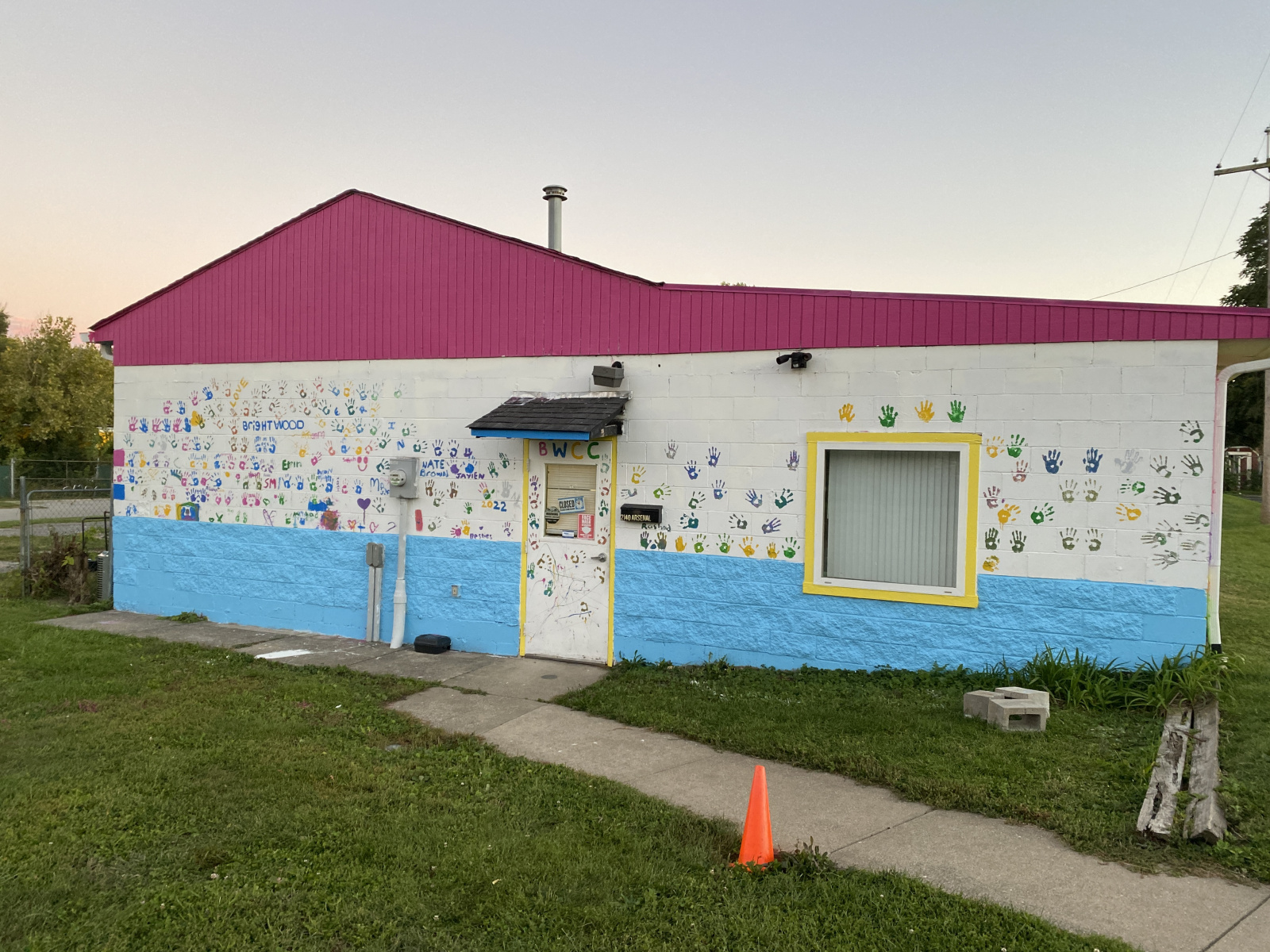 Bright Spot Mural, Brightwood Community Center, Indianapolis. This mural was commissioned as part of the Lilly Day of Service by Eli Lilly & Co. and Keep Indianapolis Beautiful, Inc, for the Brightwood Community Center, teaming with Jarrod Dortch for design and execution. The bulk of the mural was painted by Eli Lilly & Co. volunteers, and as the project was designed, grew to include all four sides of the building. September, 2022