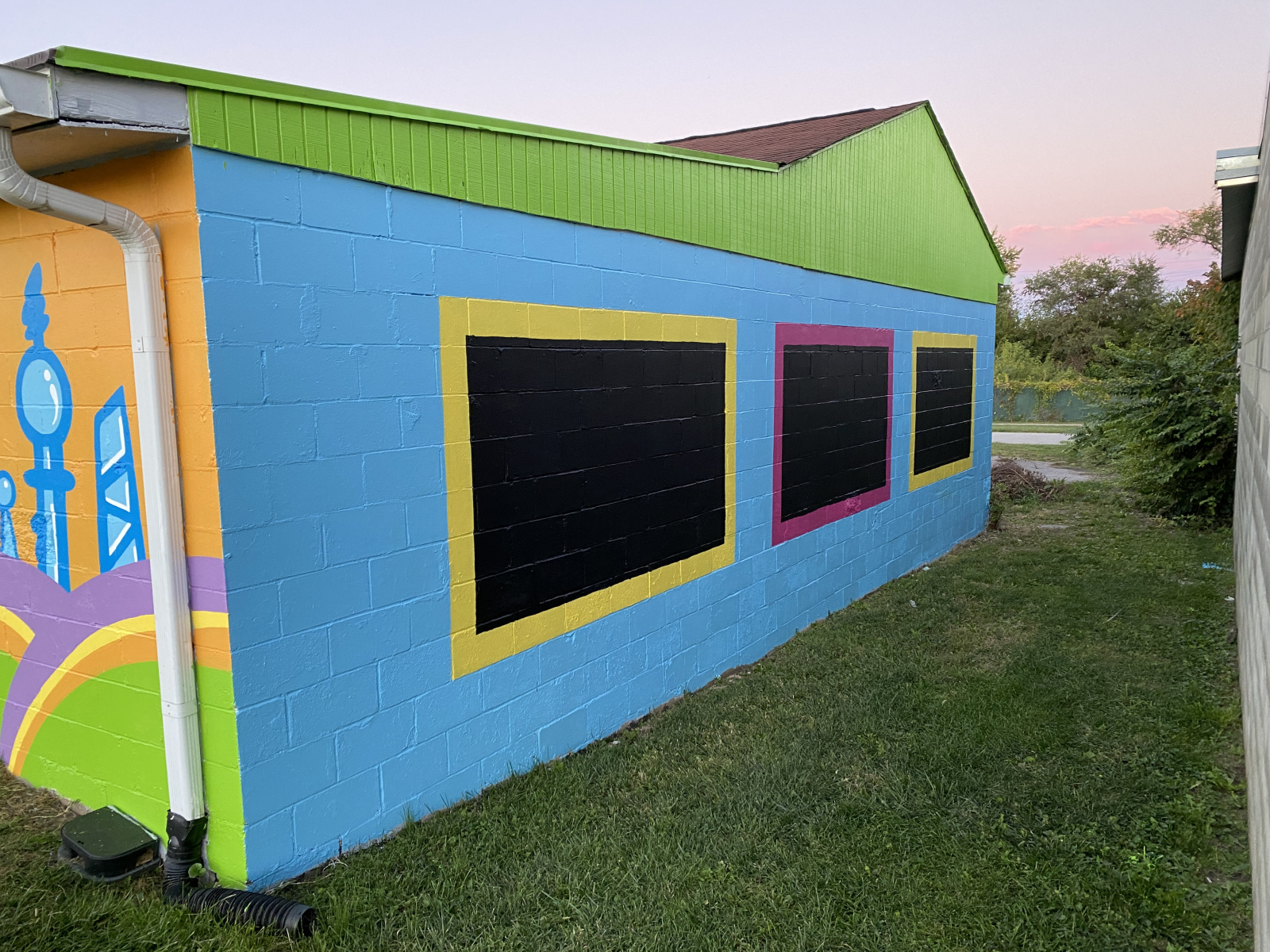Bright Spot Mural, Brightwood Community Center, Indianapolis. This mural was commissioned as part of the Lilly Day of Service by Eli Lilly & Co. and Keep Indianapolis Beautiful, Inc, for the Brightwood Community Center, teaming with Jarrod Dortch for design and execution. The bulk of the mural was painted by Eli Lilly & Co. volunteers, and as the project was designed, grew to include all four sides of the building. September, 2022