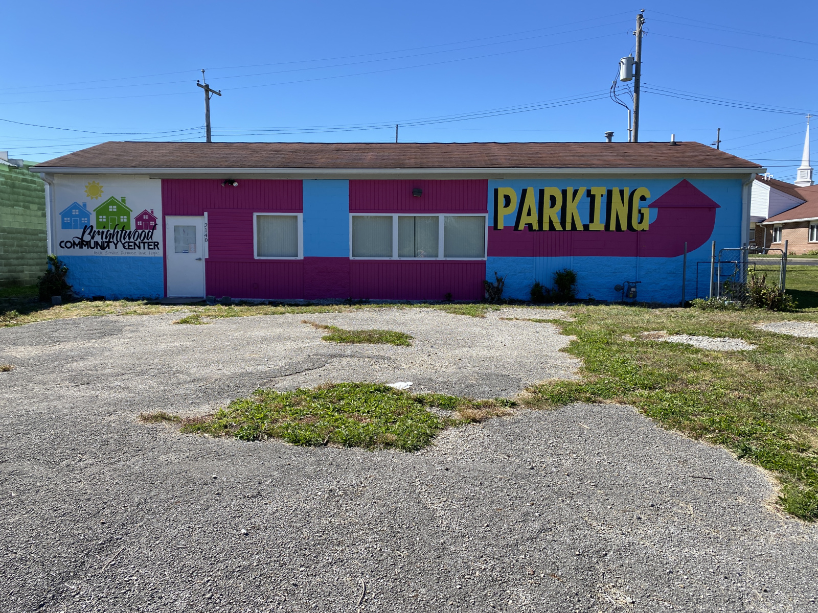 Bright Spot Mural, Brightwood Community Center, Indianapolis. This mural was commissioned as part of the Lilly Day of Service by Eli Lilly & Co. and Keep Indianapolis Beautiful, Inc, for the Brightwood Community Center, teaming with Jarrod Dortch for design and execution. The bulk of the mural was painted by Eli Lilly & Co. volunteers, and as the project was designed, grew to include all four sides of the building. September, 2022