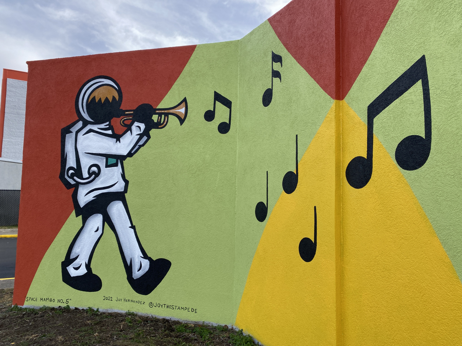 Mambo No. 5 Mural, Window to the World, Indianapolis. This mural as well as the property's proprietary design cover the service walls of the Window to the World building in Indianapolis. All together, it was a 45 square foot project, with Bean playing music, at the owner's request, on an east-facing wall. October, 2022