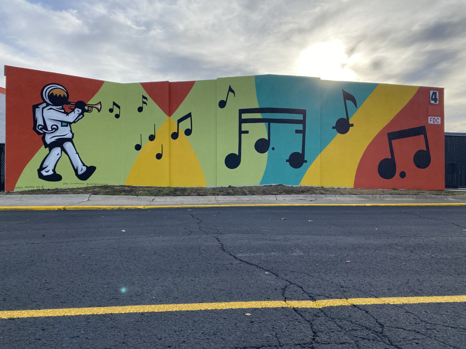 Mambo No. 5 Mural, Window to the World, Indianapolis. This mural as well as the property's proprietary design cover the service walls of the Window to the World building in Indianapolis. All together, it was a 45 square foot project, with Bean playing music, at the owner's request, on an east-facing wall. October, 2022