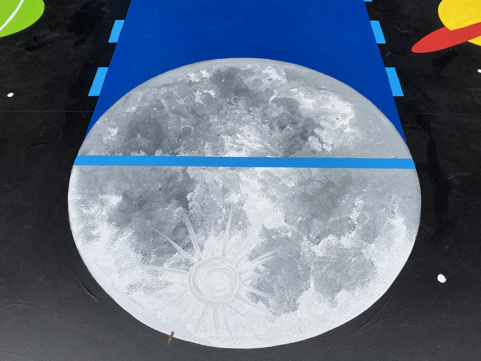 Shoot For the Stars was commissioned as a "Court Mural" for the Arts Council's SWISH NCAA March Madness programming. The backing piece is a vinyl reproduction of the "Shoot for the Stars" canvas painting, while the platform was hand painted. March, 2021