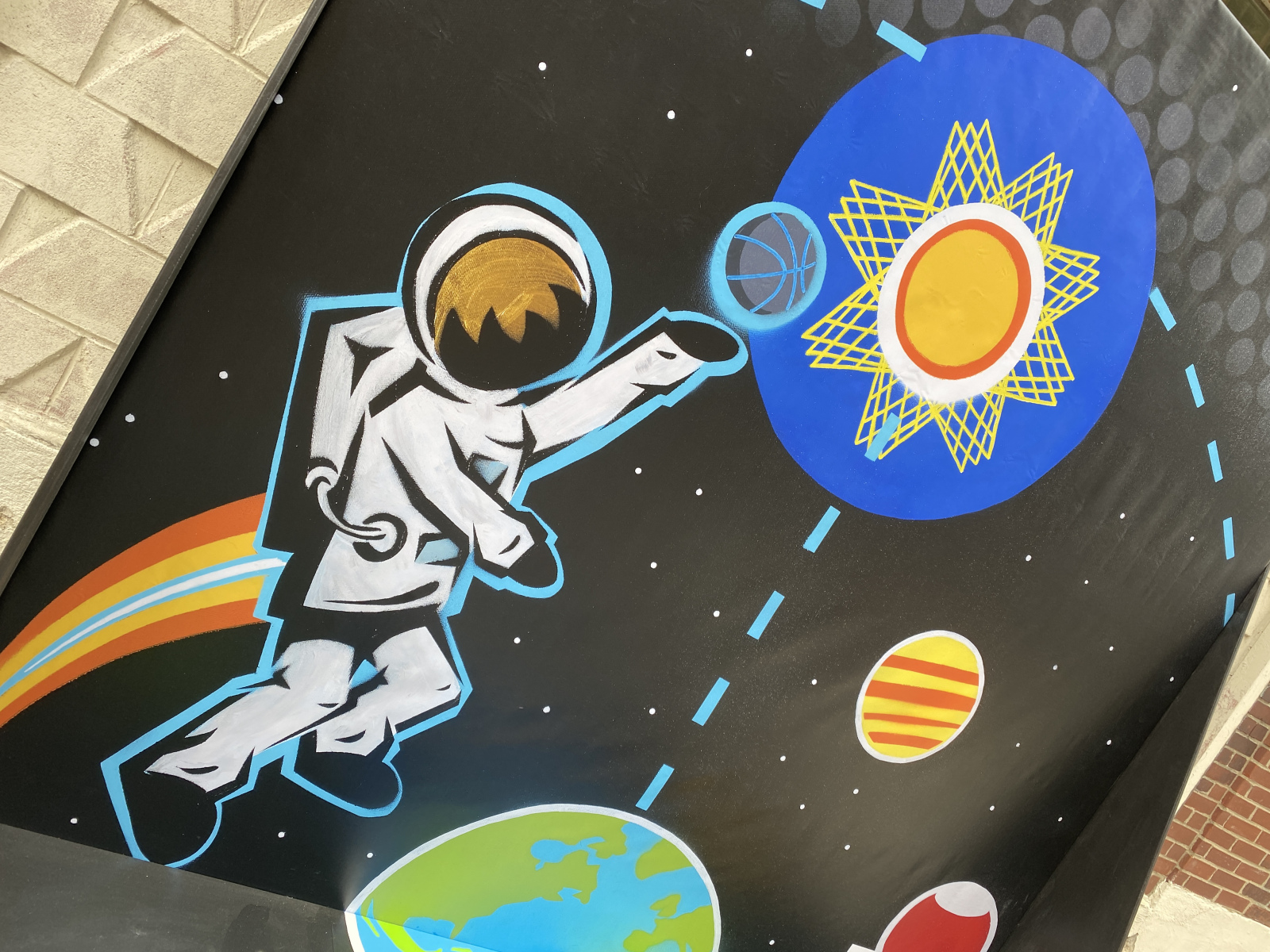 Shoot For the Stars was commissioned as a "Court Mural" for the Arts Council's SWISH NCAA March Madness programming. The backing piece is a vinyl reproduction of the "Shoot for the Stars" canvas painting, while the platform was hand painted. March, 2021