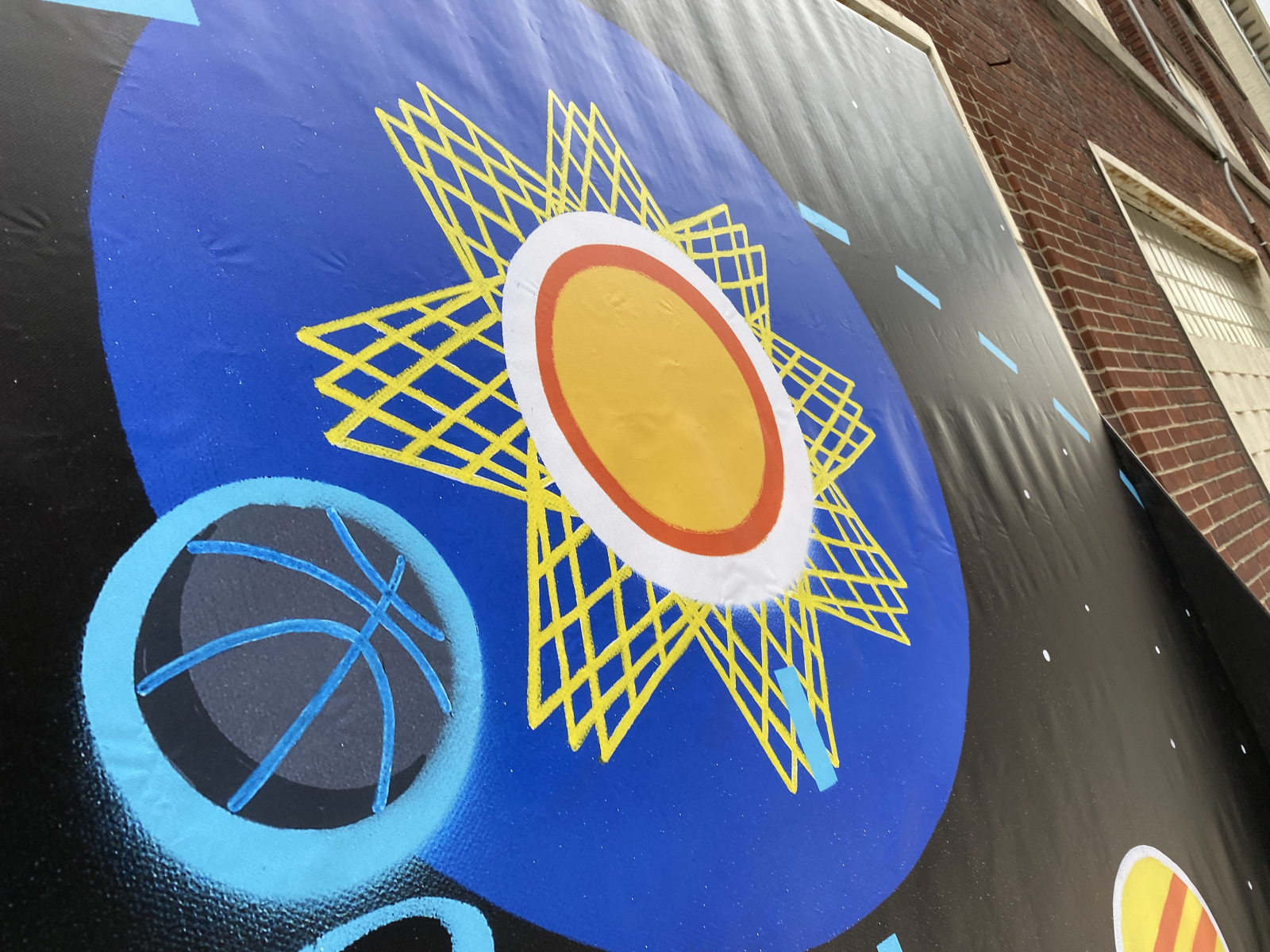 Shoot For the Stars was commissioned as a "Court Mural" for the Arts Council's SWISH NCAA March Madness programming. The backing piece is a vinyl reproduction of the "Shoot for the Stars" canvas painting, while the platform was hand painted. March, 2021