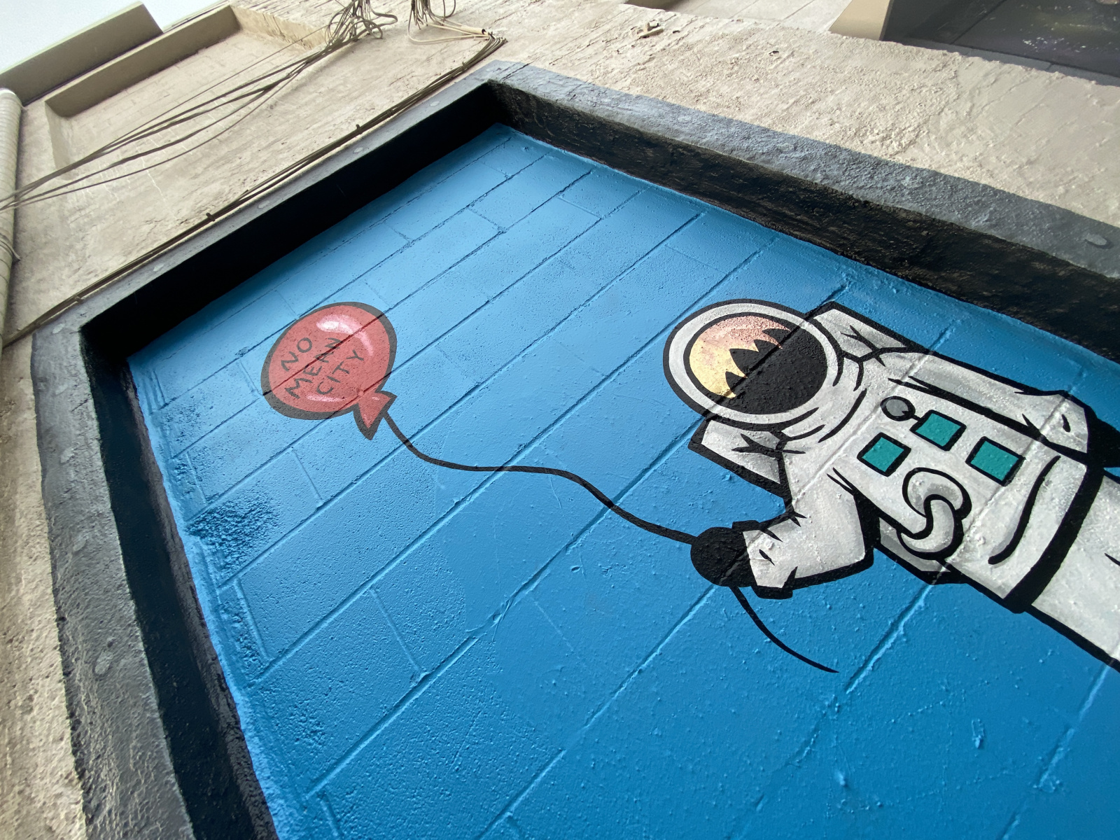 This mural is located in the alley behind Square Cat Vinyl in Fountain Square, off of Woodlawn Avenue. August, 2019 In June, 2021, the alley wall was accidentally repainted and the artists were invited back to repaint the murals. This mural changed to a blue background for the repainting, inspired by a young art fan. "No Mean City" was added to the red balloon. June, 2021