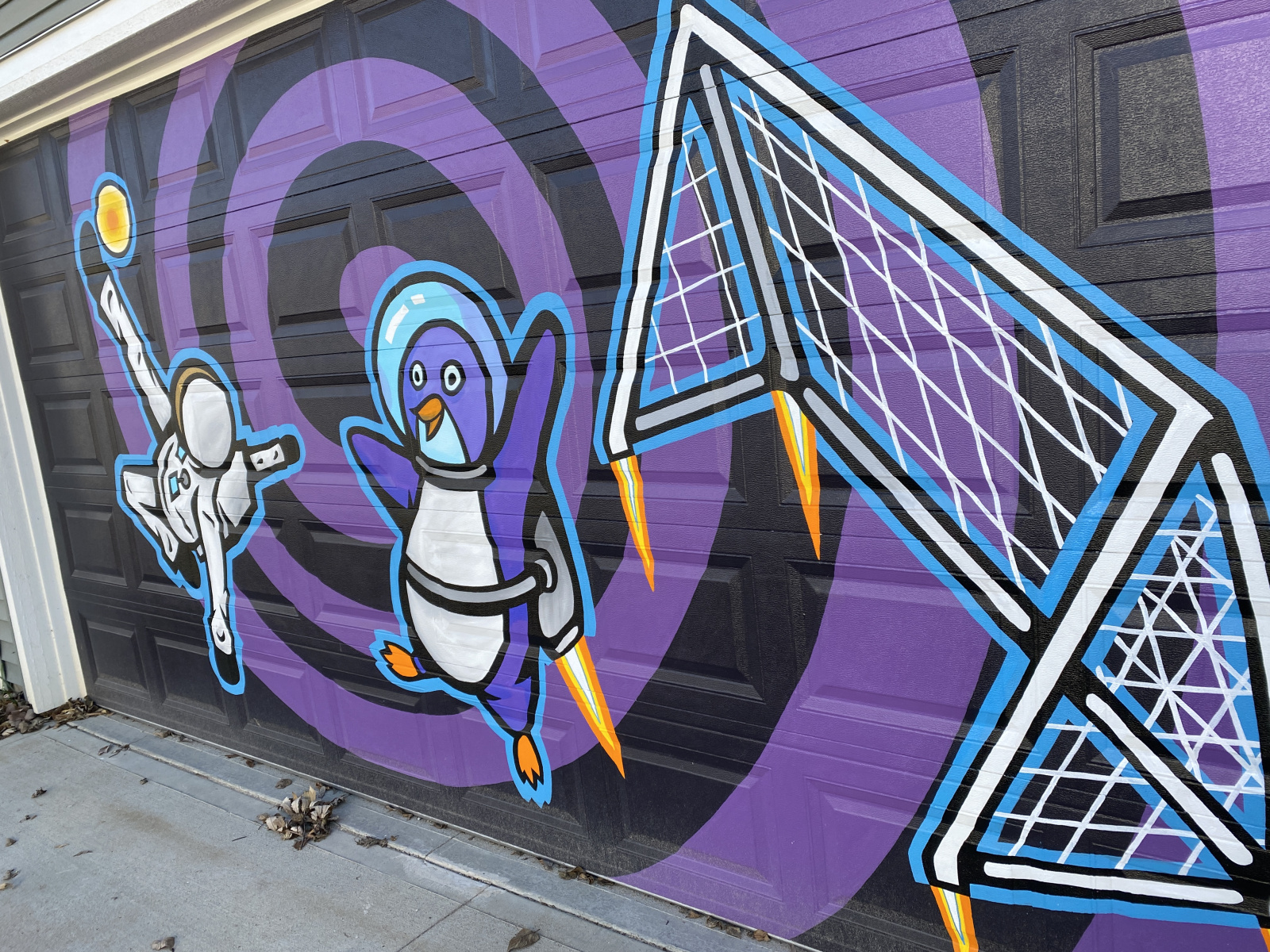Space Penguin "Space Penguin" Image 5 of 6 Space Penguin Mural, Fountain Square, Indianapolis. This mural is painted on the garage door of a private residence. Its themes were woven from the family's prompts: Purple, Bean, soccer, and a penguin. October, 2022