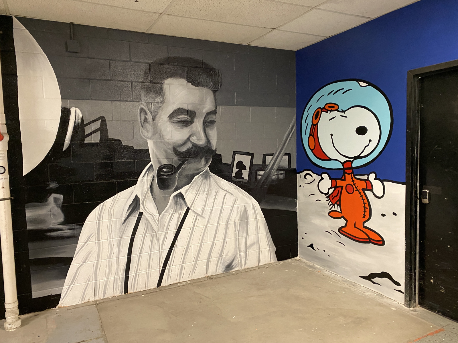 Space Snoopy Mural, CCIC. This mural is to compliment the Bill Meléndez mural next to it, as Meléndez was the lead animator and voice actor for Snoopy in the Peanuts specials. Snoopy has arrived on the moon while his doghouse plays the part of the Lunar Excursion Module. December 2021