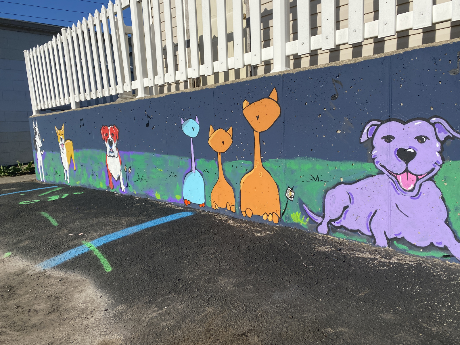The Best Summer Night Group Mural, Union Jack, Broad Ripple, Indianapolis. This mural was painted on a retaining wall behind Union Jack in the Broad Ripple neighborhood of Indianapolis. It was part of a group setup featuring matthewaaron's left-handed cats, Christopher Harden's "badly-drawn" dogs, Shelby Kelly's Dead City rats, as well as Bean the Astronaut. April, 2022