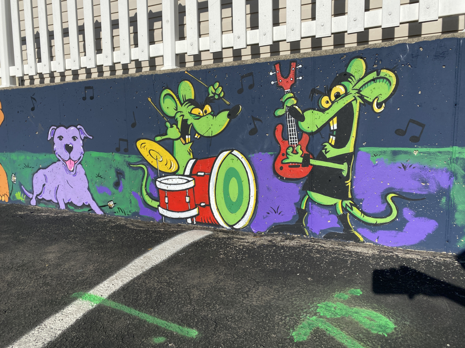 The Best Summer Night Group Mural, Union Jack, Broad Ripple, Indianapolis. This mural was painted on a retaining wall behind Union Jack in the Broad Ripple neighborhood of Indianapolis. It was part of a group setup featuring matthewaaron's left-handed cats, Christopher Harden's "badly-drawn" dogs, Shelby Kelly's Dead City rats, as well as Bean the Astronaut. April, 2022