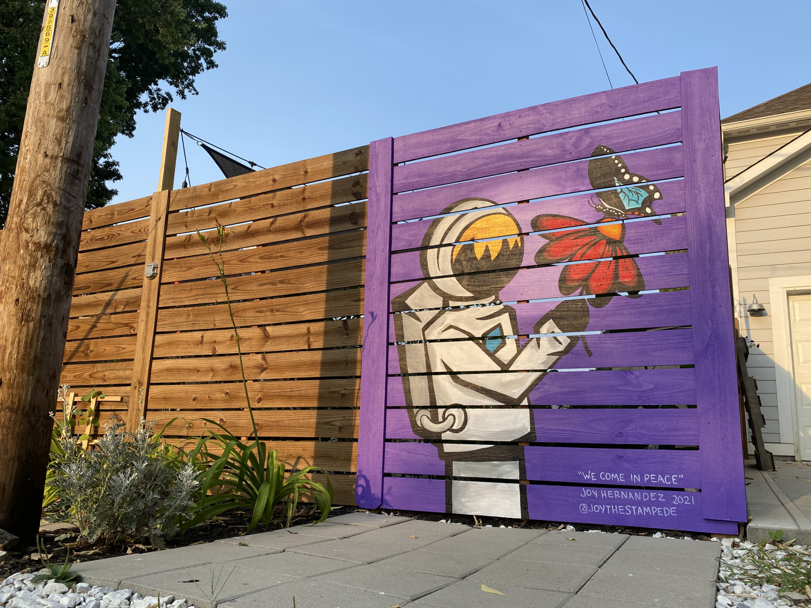 We Come In Peace "We Come In Peace" Image 3 of 4 This mural was painted on a fence panel at a private residence in Indianapolis, IN. August, 2021.