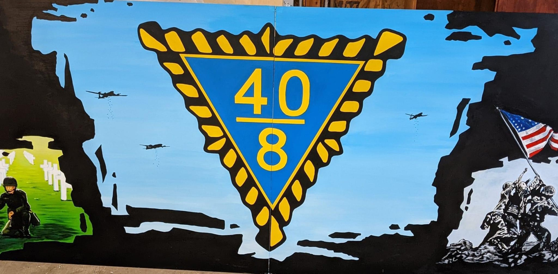 40&8 Mural Restoration 2.0, Annawan, Illnois. It became apparent that the original panels for this mural set had seen their best days. The mural set was repainted on fresh aluminum panels, inspired by the series of murals originally painted by Dave Washburn, but with some updated imagery added by his son, Tom Washburn, along with Joy Hernandez. July, 2022.