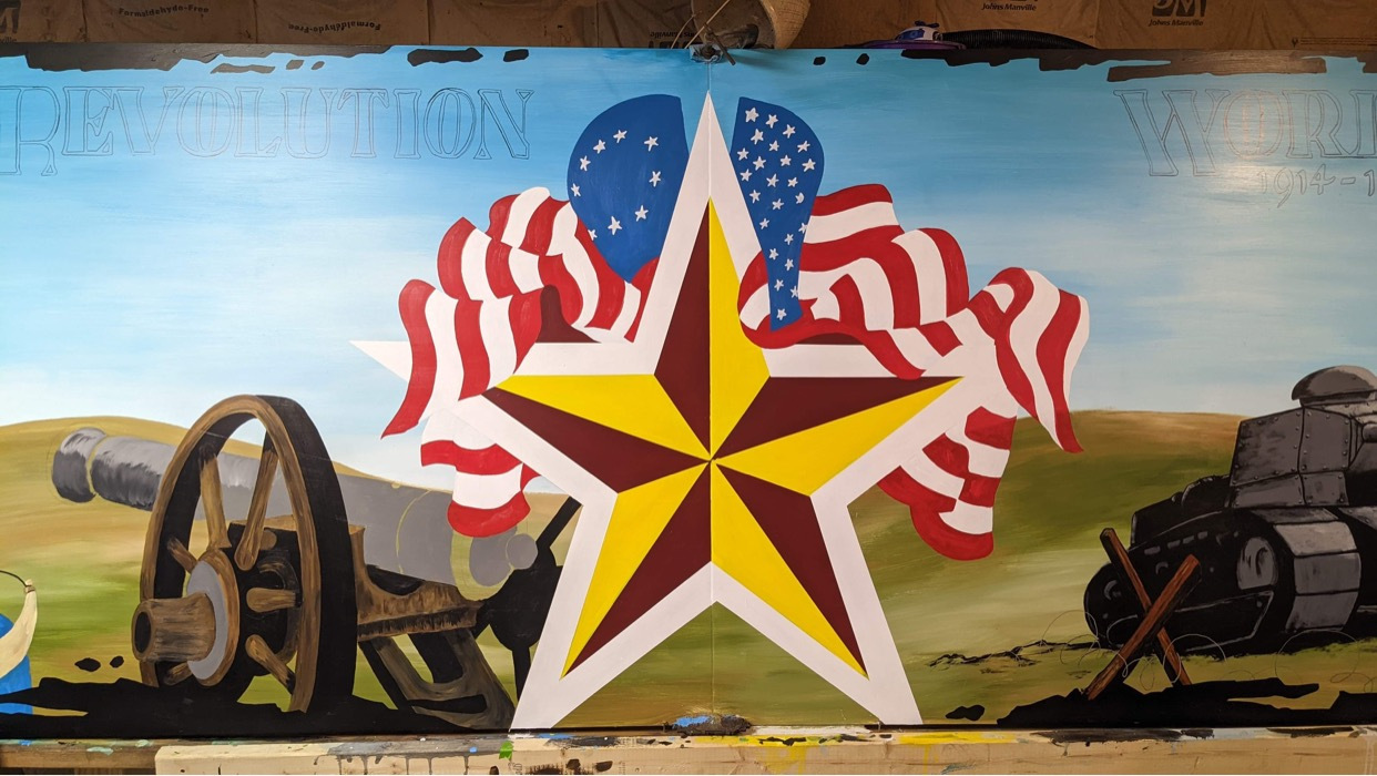 40&8 Mural Restoration 2.0, Annawan, Illnois. It became apparent that the original panels for this mural set had seen their best days. The mural set was repainted on fresh aluminum panels, inspired by the series of murals originally painted by Dave Washburn, but with some updated imagery added by his son, Tom Washburn, along with Joy Hernandez. July, 2022.