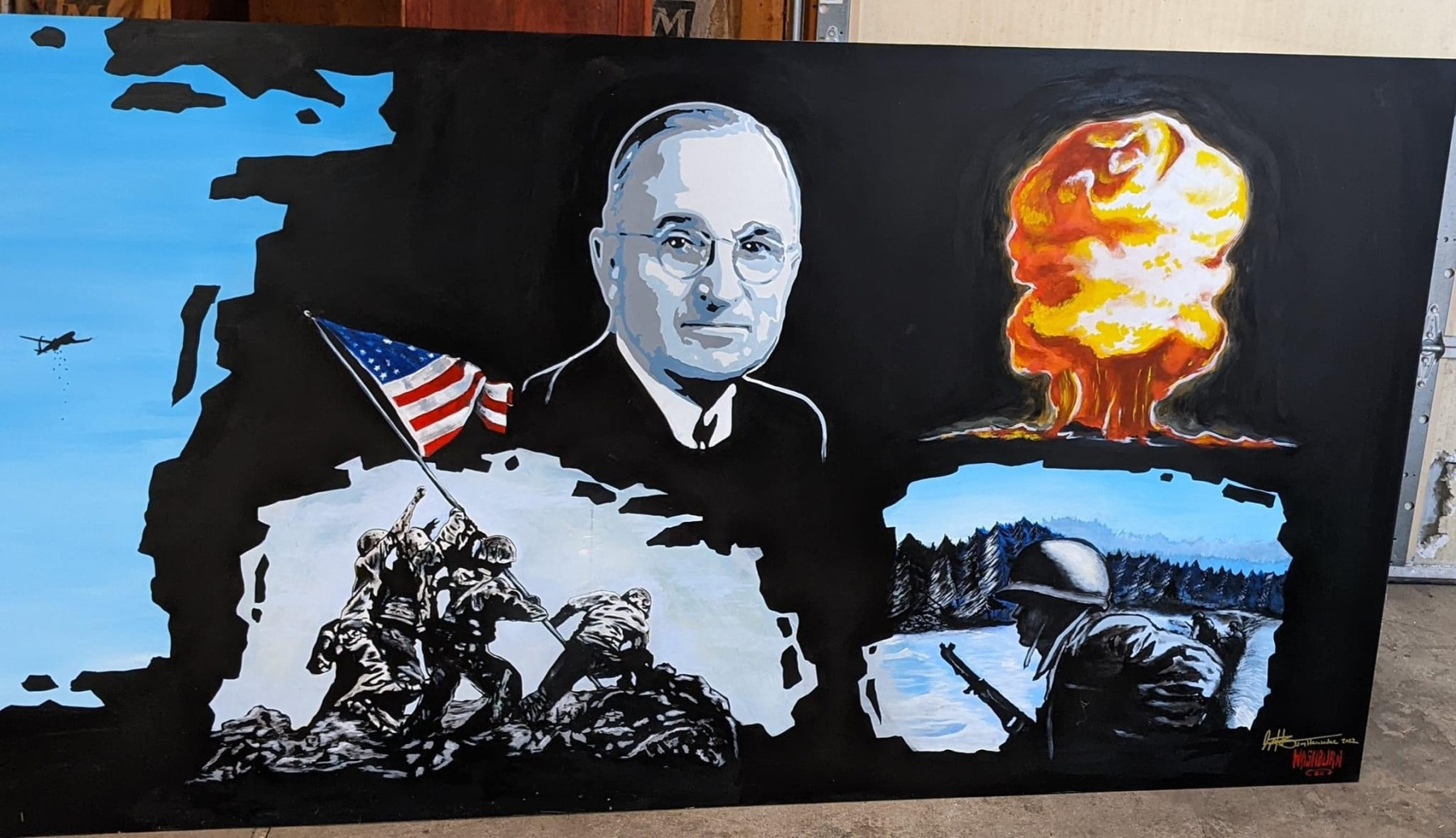 40&8 Mural Restoration 2.0, Annawan, Illnois. It became apparent that the original panels for this mural set had seen their best days. The mural set was repainted on fresh aluminum panels, inspired by the series of murals originally painted by Dave Washburn, but with some updated imagery added by his son, Tom Washburn, along with Joy Hernandez. July, 2022.