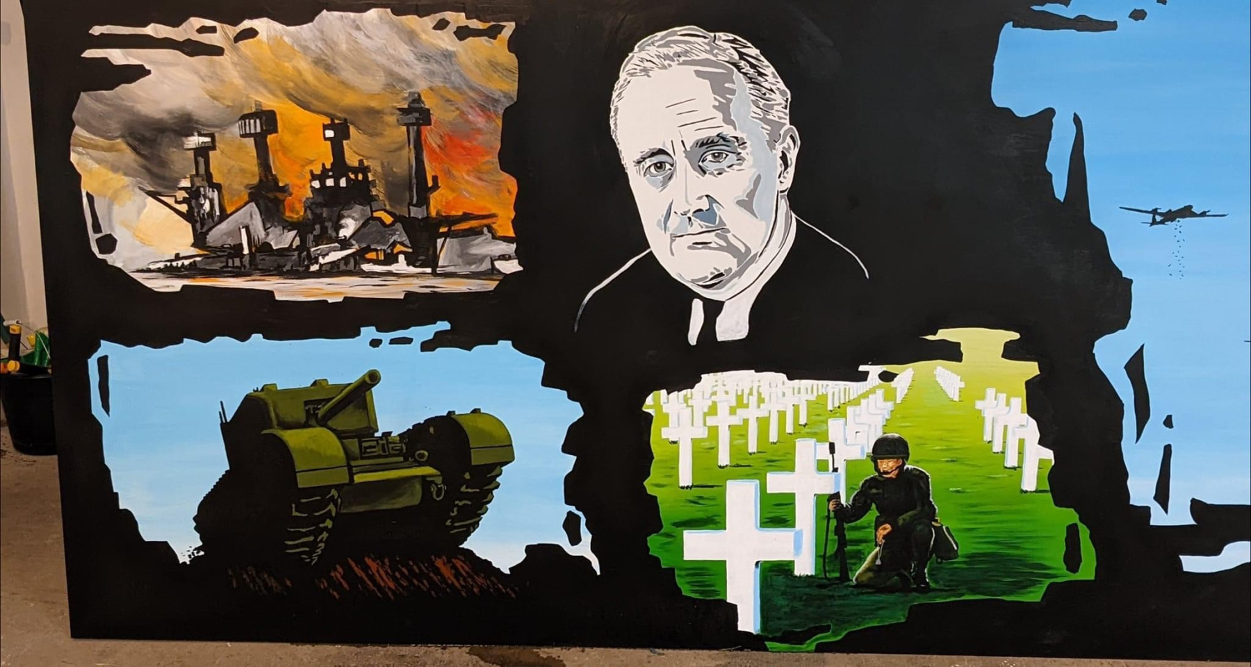 40&8 Mural Restoration 2.0, Annawan, Illnois. It became apparent that the original panels for this mural set had seen their best days. The mural set was repainted on fresh aluminum panels, inspired by the series of murals originally painted by Dave Washburn, but with some updated imagery added by his son, Tom Washburn, along with Joy Hernandez. July, 2022.