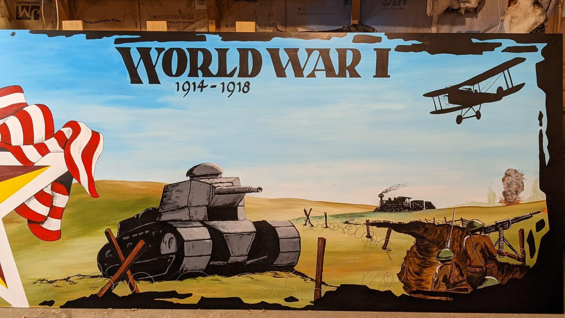 40&8 Mural Restoration 2.0, Annawan, Illnois. It became apparent that the original panels for this mural set had seen their best days. The mural set was repainted on fresh aluminum panels, inspired by the series of murals originally painted by Dave Washburn, but with some updated imagery added by his son, Tom Washburn, along with Joy Hernandez. July, 2022.