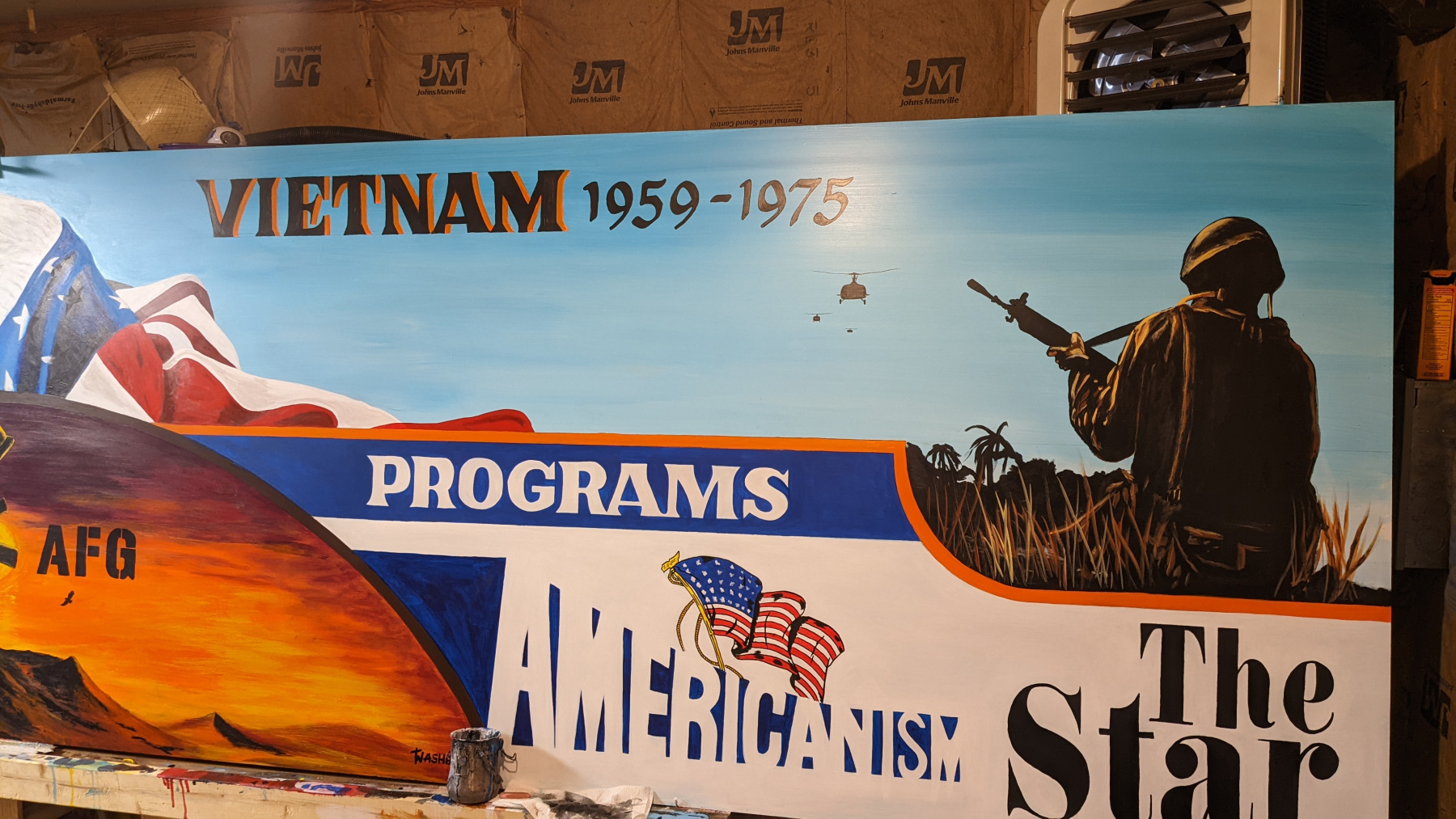 40&8 Mural Restoration 2.0, Annawan, Illnois. It became apparent that the original panels for this mural set had seen their best days. The mural set was repainted on fresh aluminum panels, inspired by the series of murals originally painted by Dave Washburn, but with some updated imagery added by his son, Tom Washburn, along with Joy Hernandez. July, 2022.