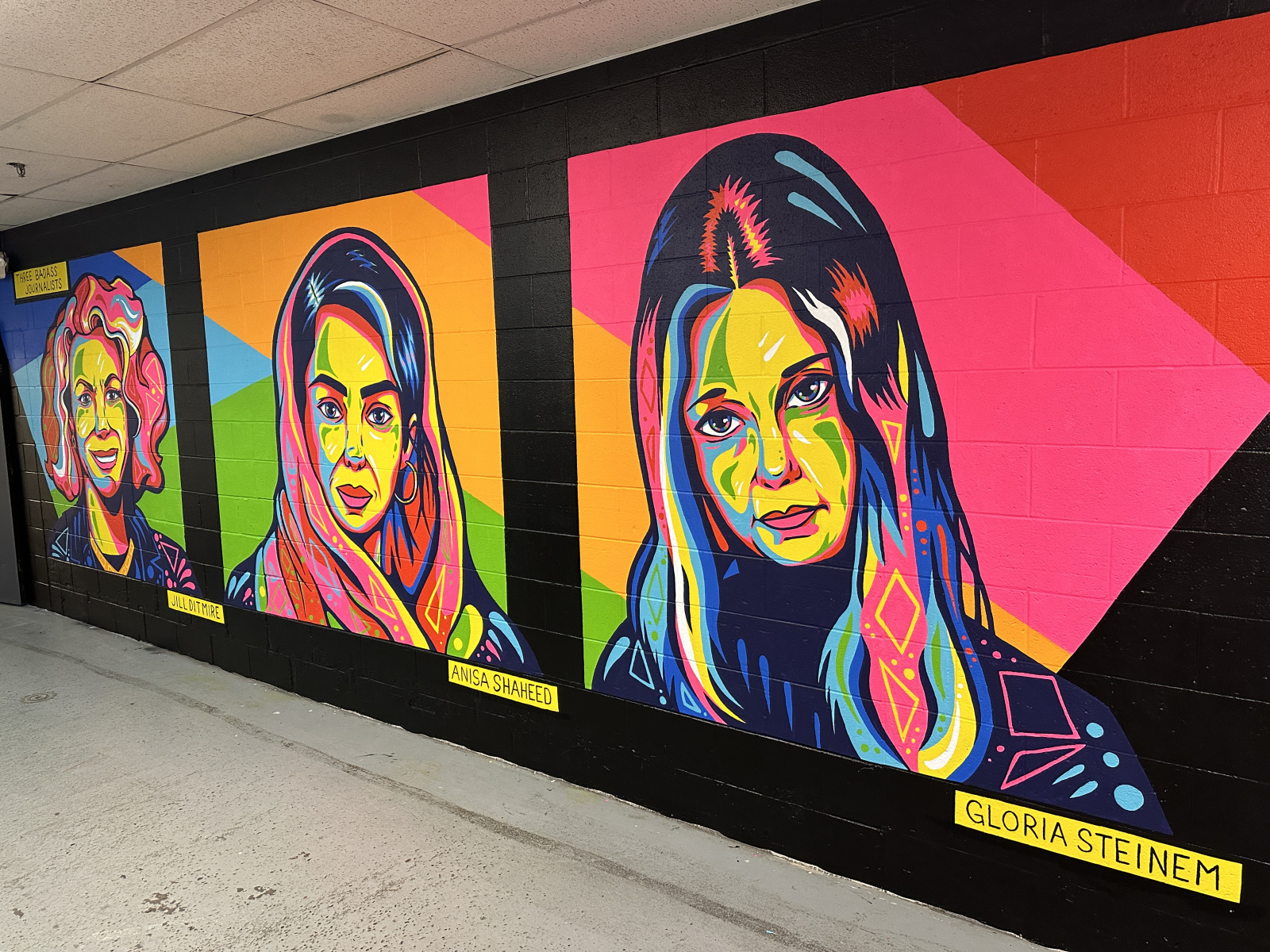 Three Bad @ss Journalists mural. This mural was painted inside of the Circle City Industrial Complex in Indianapolis, IN, to honor late local journalist Jill Ditmire, as well as Afghan journalist Anisa Shaheed, and Gloria Steinem, who began her career as a journalist. Painted with the help of several friends who also wanted to honor Ditmire, of note was Ditmire's best friend, Bill Foley, whose image of her this mural was based on. March, 2023.
