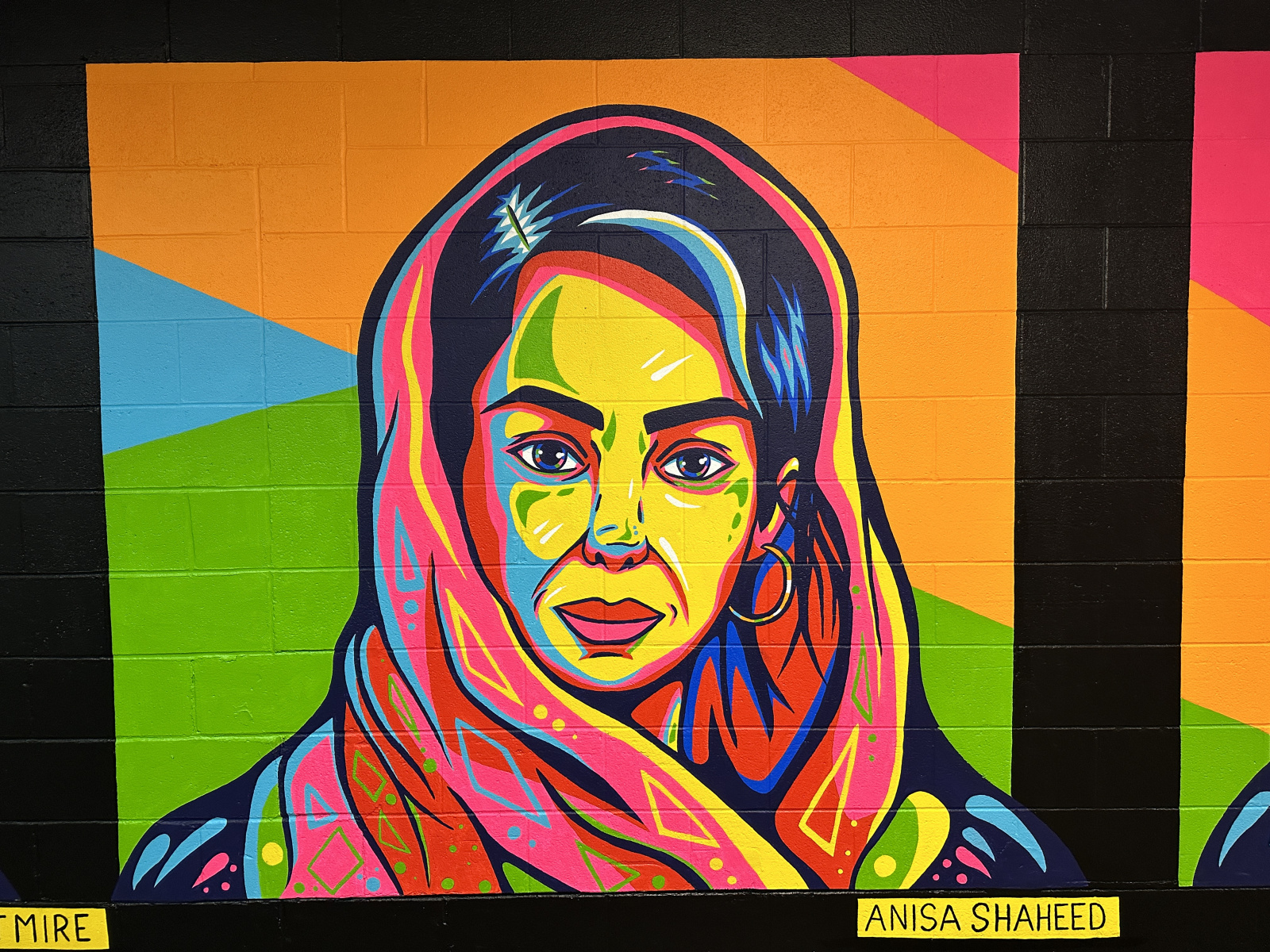 Three Bad @ss Journalists mural. This mural was painted inside of the Circle City Industrial Complex in Indianapolis, IN, to honor late local journalist Jill Ditmire, as well as Afghan journalist Anisa Shaheed, and Gloria Steinem, who began her career as a journalist. Painted with the help of several friends who also wanted to honor Ditmire, of note was Ditmire's best friend, Bill Foley, whose image of her this mural was based on. March, 2023.