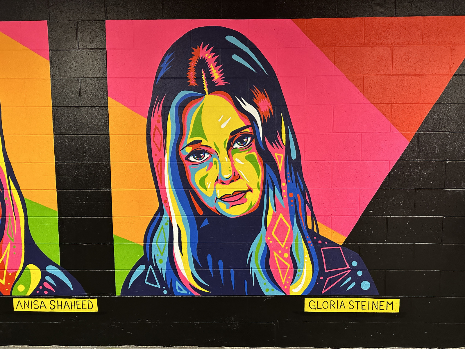 Three Bad @ss Journalists mural. This mural was painted inside of the Circle City Industrial Complex in Indianapolis, IN, to honor late local journalist Jill Ditmire, as well as Afghan journalist Anisa Shaheed, and Gloria Steinem, who began her career as a journalist. Painted with the help of several friends who also wanted to honor Ditmire, of note was Ditmire's best friend, Bill Foley, whose image of her this mural was based on. March, 2023.