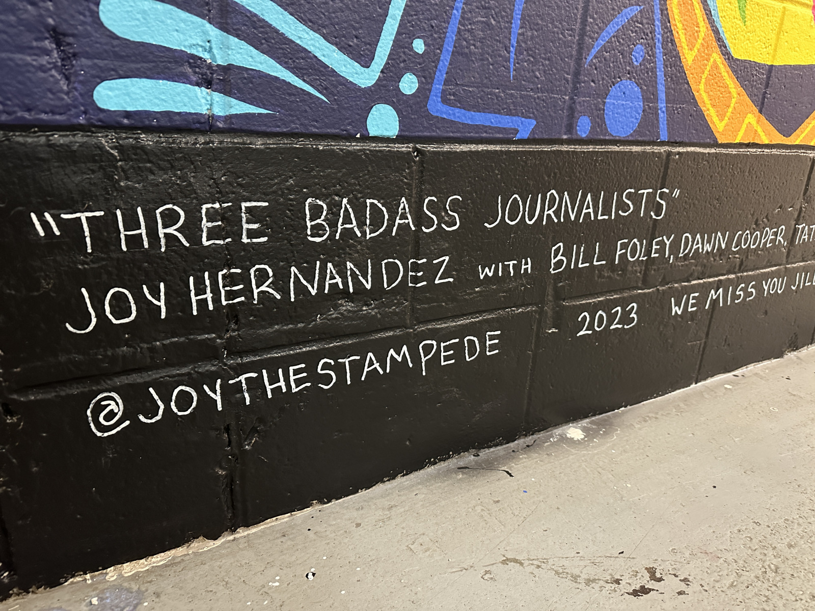 Three Bad @ss Journalists mural. This mural was painted inside of the Circle City Industrial Complex in Indianapolis, IN, to honor late local journalist Jill Ditmire, as well as Afghan journalist Anisa Shaheed, and Gloria Steinem, who began her career as a journalist. Painted with the help of several friends who also wanted to honor Ditmire, of note was Ditmire's best friend, Bill Foley, whose image of her this mural was based on. March, 2023.