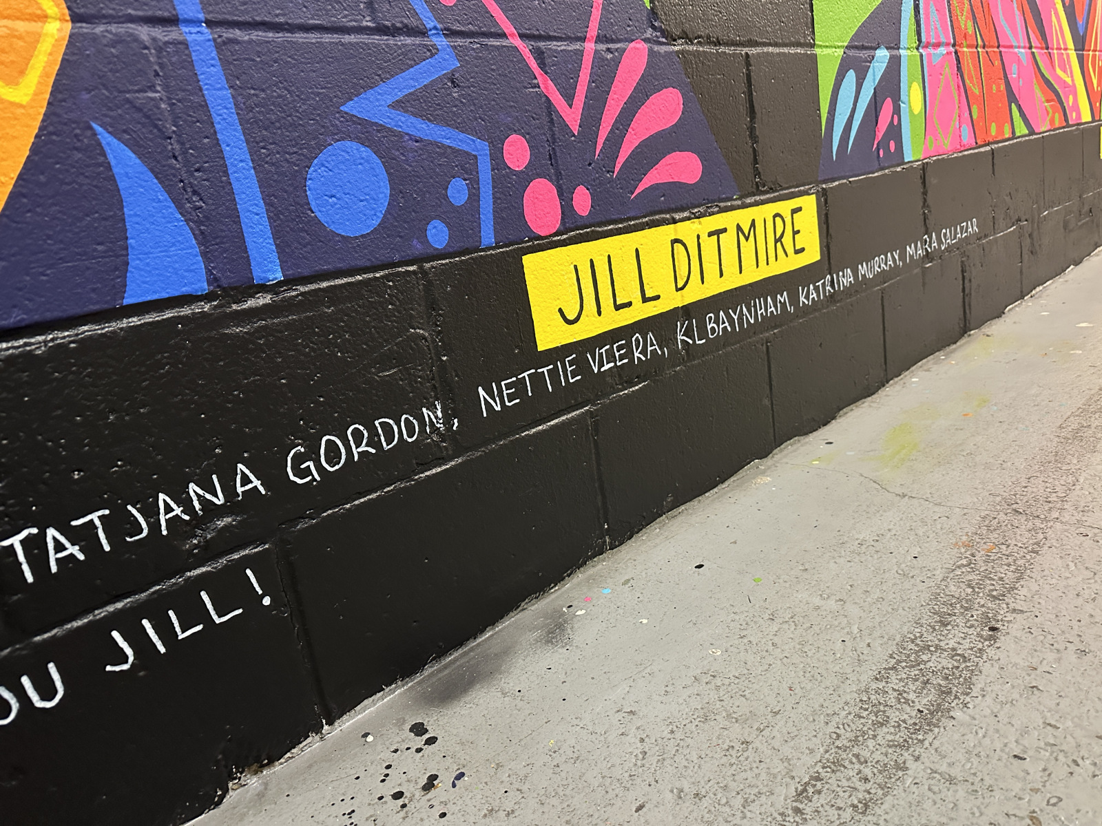 Three Bad @ss Journalists mural. This mural was painted inside of the Circle City Industrial Complex in Indianapolis, IN, to honor late local journalist Jill Ditmire, as well as Afghan journalist Anisa Shaheed, and Gloria Steinem, who began her career as a journalist. Painted with the help of several friends who also wanted to honor Ditmire, of note was Ditmire's best friend, Bill Foley, whose image of her this mural was based on. March, 2023.