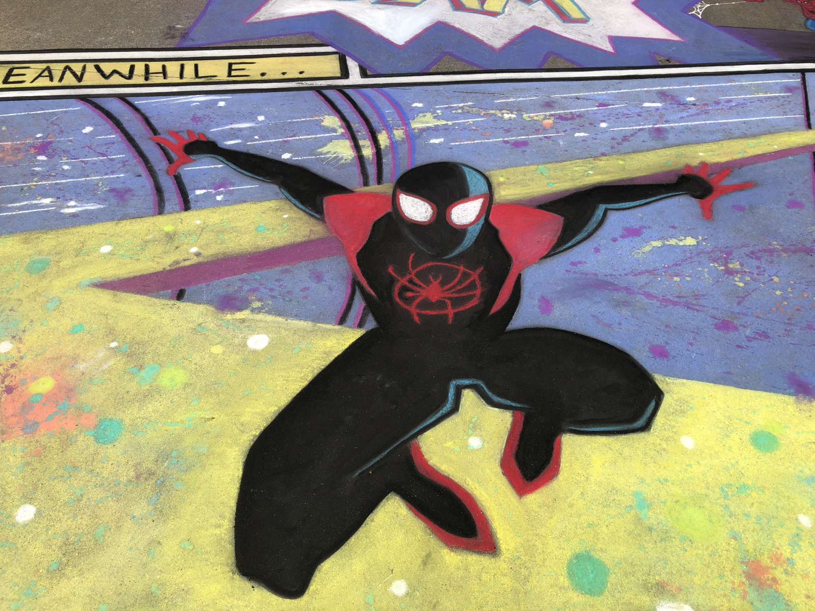Spider-Man Chalk Art . Created for the 2018 Prairie Chicken Arts Festival in Kewanee Illinois, Joy Hernandez and Thomas Washburn, along with Washburn's wife Angela Washburn and their friends Katie Shook and Ebonee Gonzalez, drew Spider-Man from the film "Into the Spider-Vers," comic book-style, in about a day's time. These chalk art pieces helped cement the idea that art team-ups were a great idea. July, 2018.